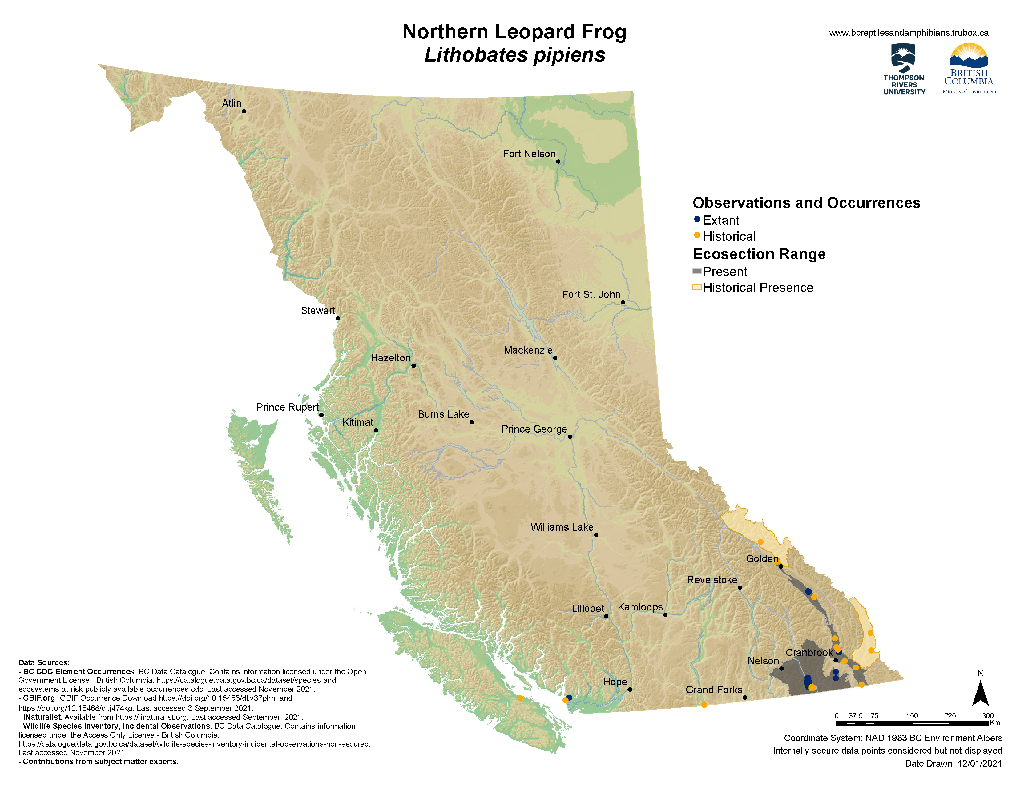 B.C. Conservation Data Centre. 2010. Species Summary: Lithobates pipiens. B.C. Minist. of Environment. Available:https://a100.gov.bc.ca/pub/eswp/ (accessed May 24, 2021).